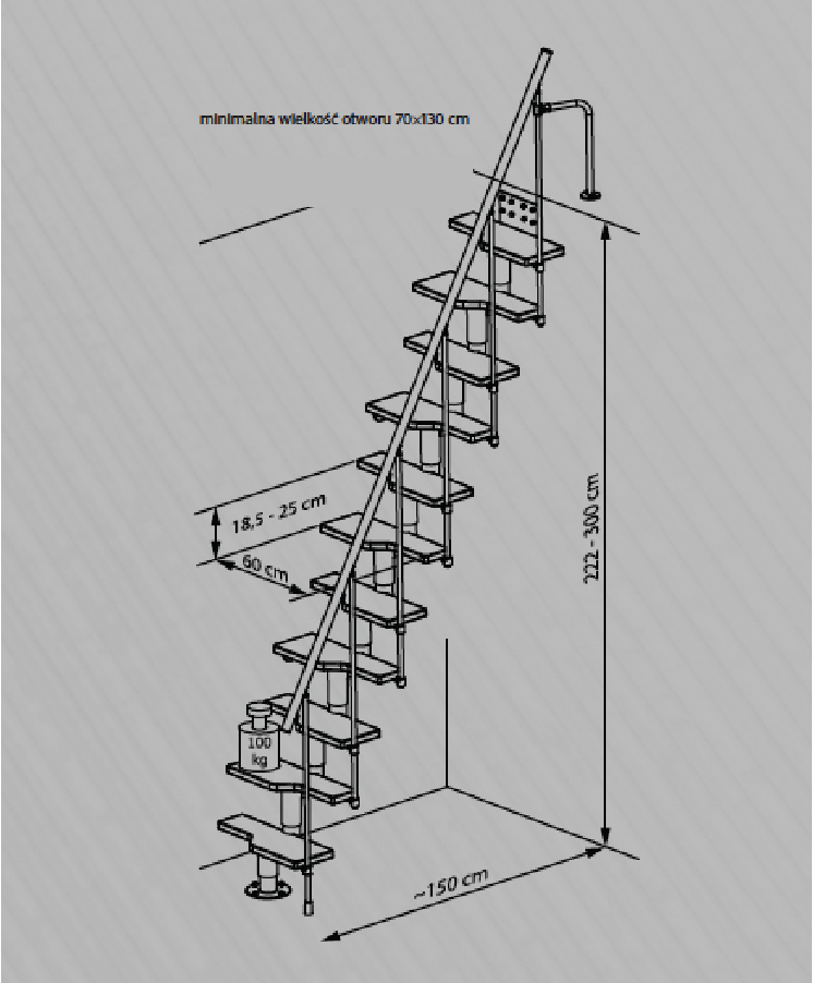 Lloji – Shkallë modulare e projektuar për hapsira të limituara Struktura – E prodhuar nga çelik i veshur me pluhur(gri RAL 9006) – Mbajtës njëanësh me shtylla vertikale (universal, mund të montohet si në të majtë edhe në të djathtë – Dorezë mbajtëse e prodhuar nga material PE (40mm) Shkelësja e shkallës – Shkelëse prej druri të plotë, e trajtuar me llak, me ngjyrë natyrale (alder); – Shkelëse me trashësi 4 cm; Mënyra e montimit – E projektuar për montim “DIY”(bëje vetë) – Lartësia e shkallëve rregullohet sipas dëshirës – I përshtatshëm për montim në sistem të drejtë ose në konfigurim me kthesë në të djathtë ose të majtë.